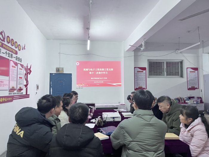 为进一步深入学习贯彻习近平新时代中国特色社会主义思想,2023年12月19日,机电系教工党支部组织全体党员在党员活动中心开展了集中学习活动,会议由支部书记张思怡同志主持。