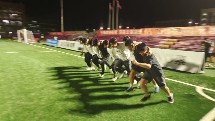 袋鼠跳训练现场充满欢声笑语。队员们套上布袋,努力模仿袋鼠的姿态向前跃进。起初,不少人因平衡把控不好频繁失误,但大家没有气馁,而是互相鼓励与学习,队员们的动作越来标准,速度越来越越快。训练场边的加油声、笑声此起彼伏,满是青春的活力与朝气。